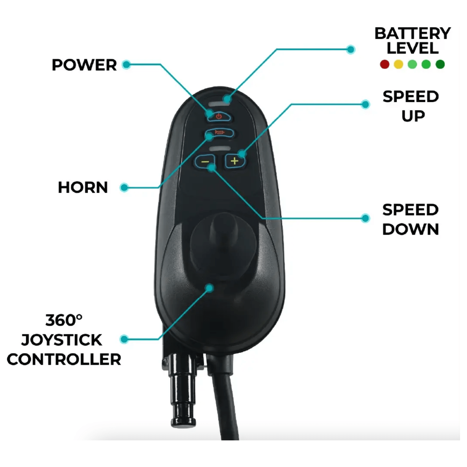 - Control the direction and speed using the joystick on the armrest