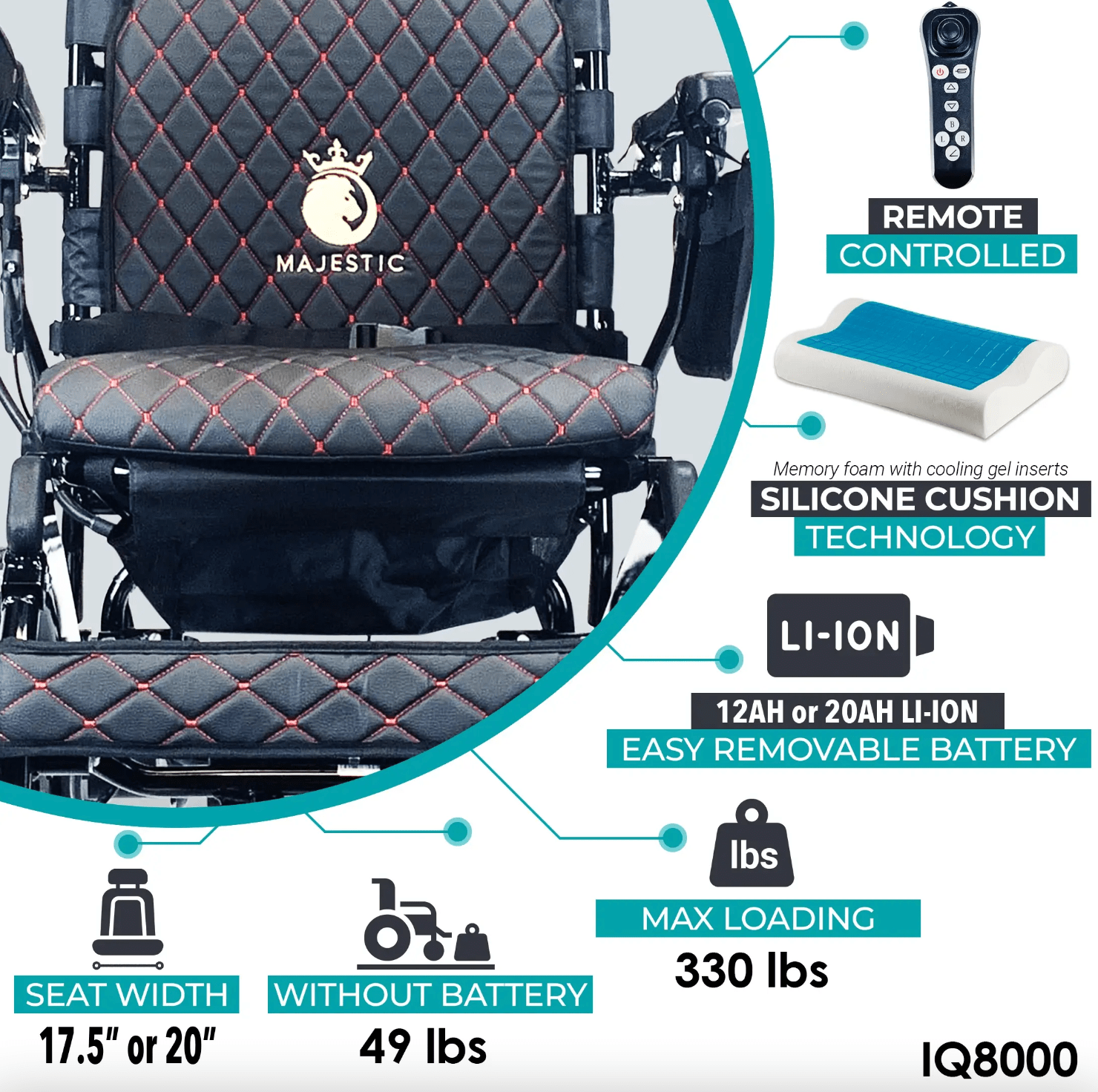 The IQ 8000 is considered the "base model" of the IQ series. If you are looking for more feature rich chairs, check out the 7000 and 9000 versions. Experience the ultimate freedom and control with our electric wheelchair series, powered by efficient li-ion batteries and equipped with two DC 250W motors, delivering a total of 500W motor power. Enjoy seamless navigation with the Majestic Electric Wheelchair with its intelligent 360-degree waterproof joystick controls conveniently located on the armrest. The joystick includes a power button, battery indicator light, horn, and speed selections, allowing users to adjust direction and speed effortlessly. There are two ways to control this remote control wheelchair; the user-controlled joystick or the hand-held wireless remote control. The remote control allows caregivers to control the wheelchair remotely. Experience the future of mobility with the Majestic IQ 8000!